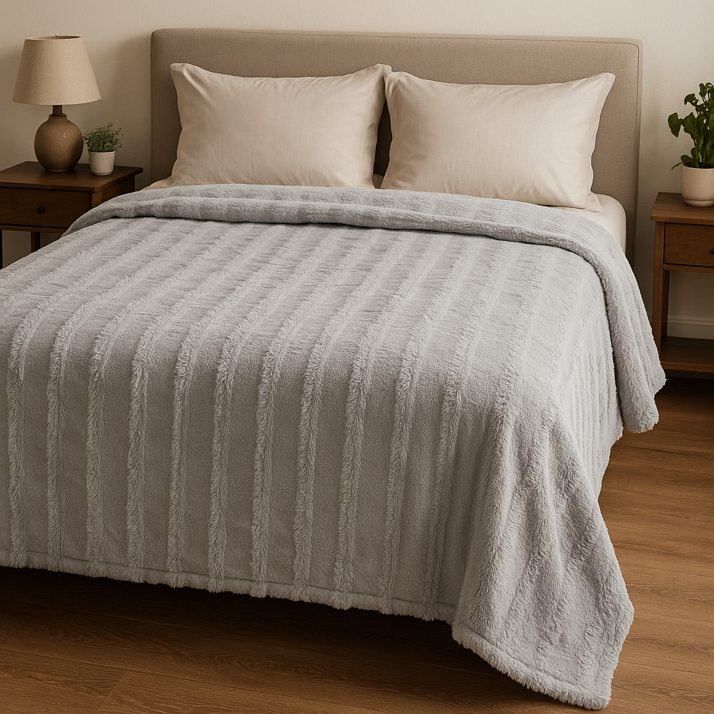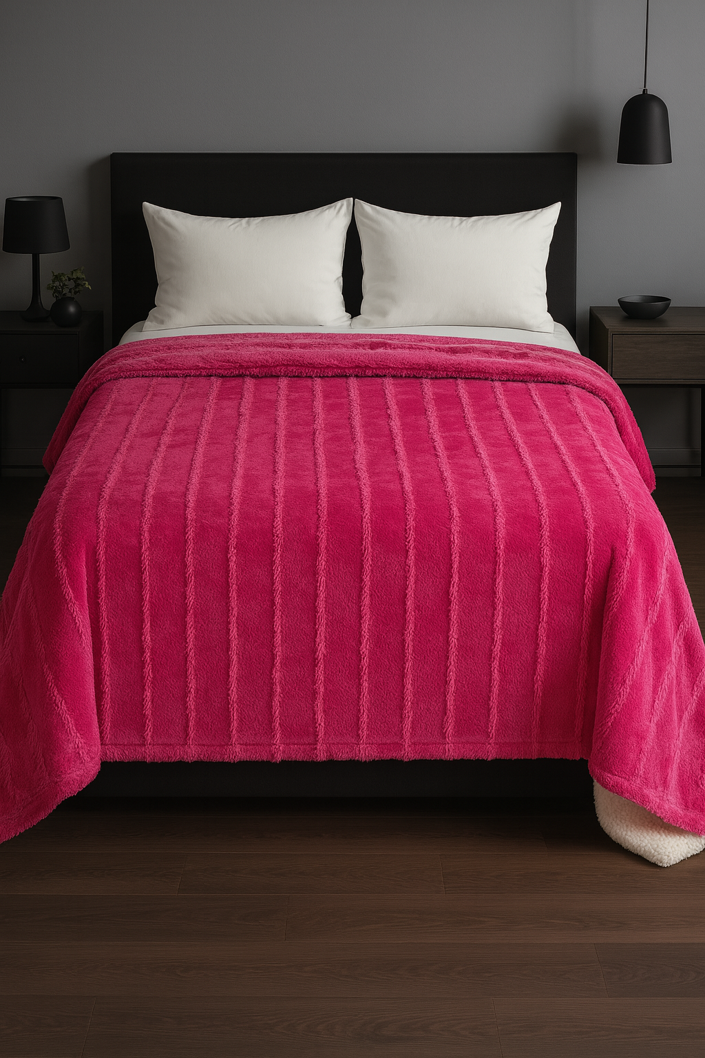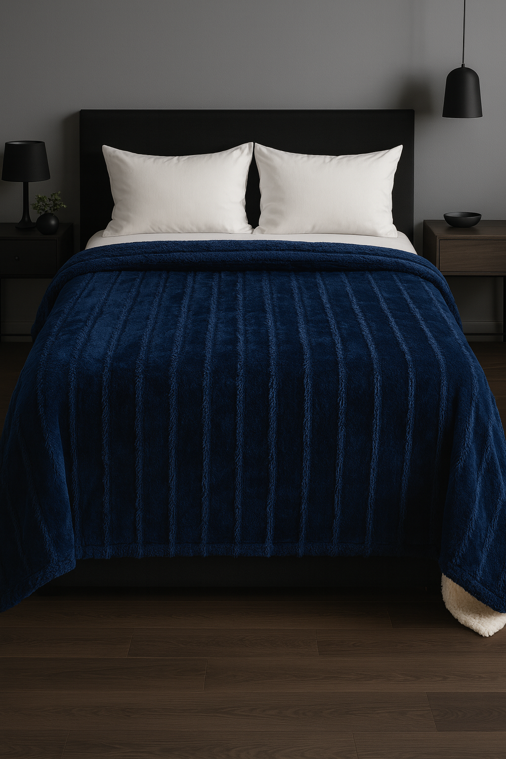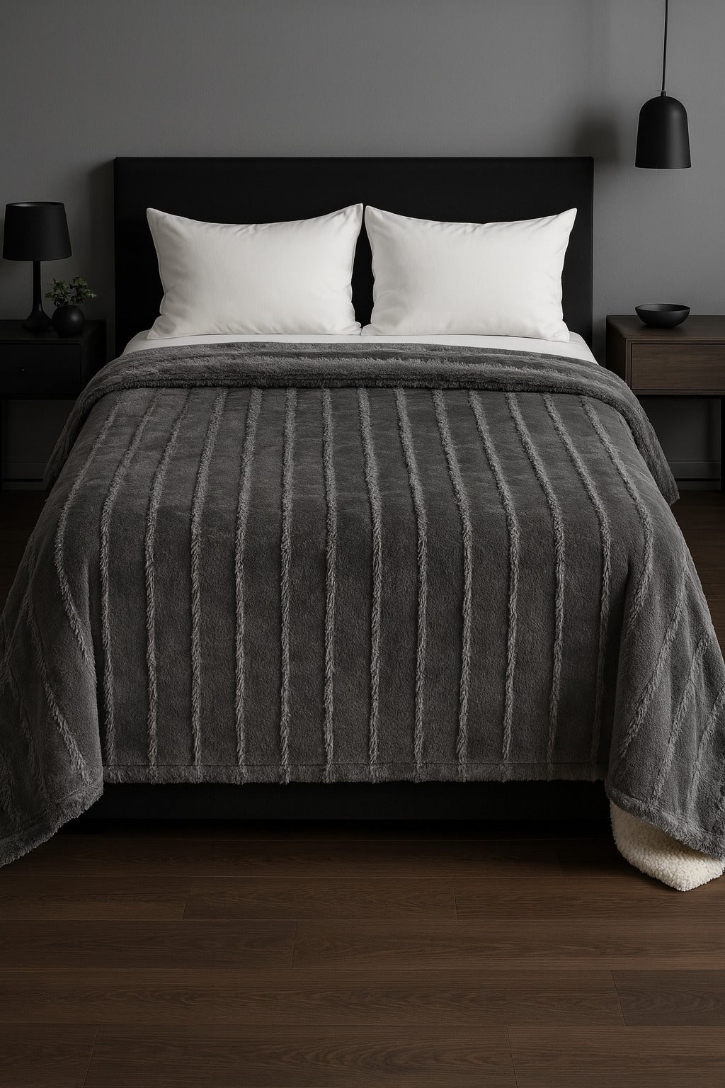 Nada como envolverte en una frazada que combina estilo, abrigo y confort. Esta frazada de dos plazas (Queen) tiene un diseño moderno con textura acanalada y reverso de corderito ultra suave, ideal para los días fríos.